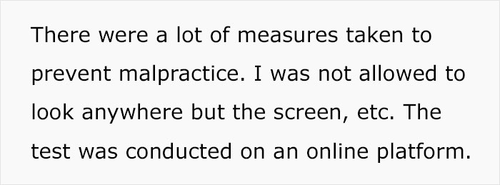 One of the interview parts included a test that helps the workplace to see how competent the interviewee is. The requirements included doing the test all by yourself, searching on the internet, and remaining silent. The interview was conducted online, so the narrator was doing it at home. Knowing this, the husband told this to his wife and asked her to be silent during that time.